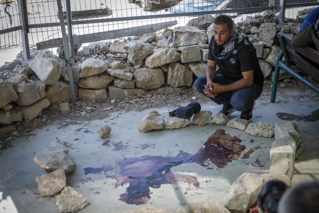 À l’endroit où Awdah est tombé, les habitants ont disposé des pierres autour du béton taché de sang.